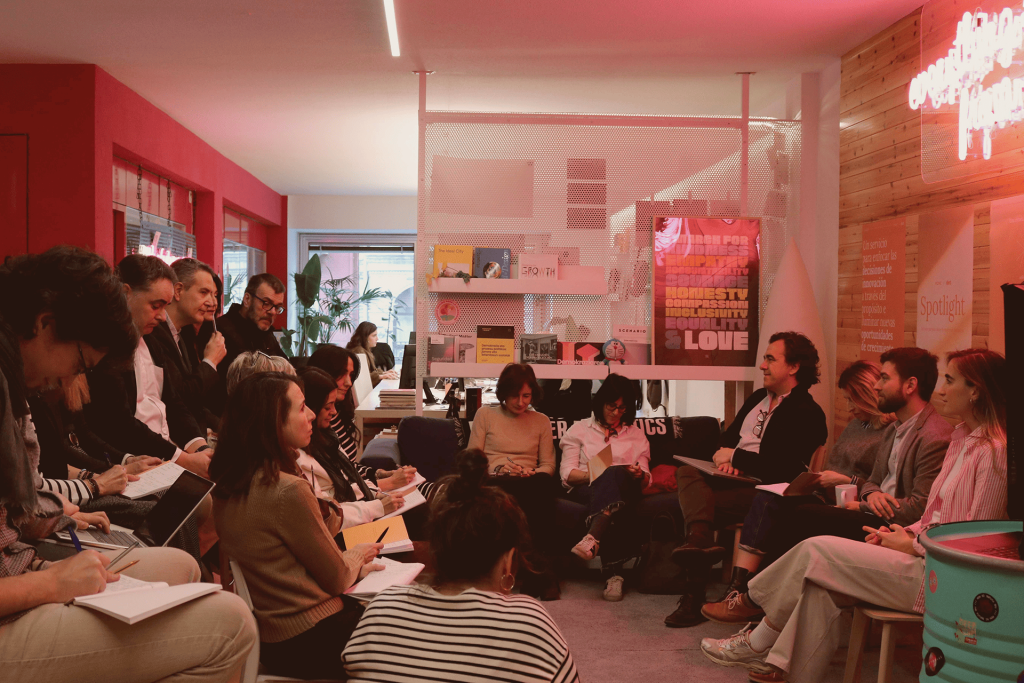 La primera sesión de Spotlight Collective reunió en Bilbao a organizaciones referentes como Eusko Legebiltzarra – Parlamento Vasco, Bilbao Metropoli 30, Cluster GAIA, Mondragon Team Academy – MTA World, BASQUE FOOD CLUSTER, UNICEF Euskadi, Innobasque | Agencia Vasca de la Innovación, Café Fortaleza, Angulas Aguinaga, Urbegi Social Impact, Bizkaia Talent, Seed Capital Bizkaia, ZINEBI – Festival Internacional de Cine Documental y Cortometraje de Bilbao y BBK Fundación Bancaria, en un primer espacio de conversación honesta sobre los retos y oportunidades de innovar con propósito desde dentro de las organizaciones.